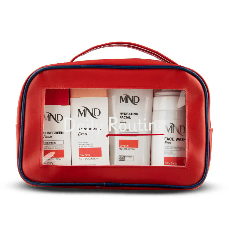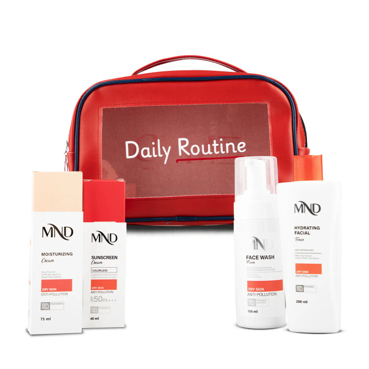 این پک مراقبت روزانه MND مناسب پوستهای خشک بوده و شامل فوم شستشو، تونر صورت آبرسان، کرم مرطوب کننده و کرم ضدآفتاب است.